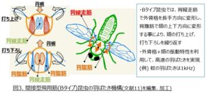 Bタイプ(間接型): 蜂やハエ、蚊は、飛翔筋による外骨格の弾性変位を “てこ” の原理で拡大し、羽ばたく(図3.) また、神経パルス周波数νの n (整数)倍を (外骨格+翅)の固有振動数と一致させる事.により、高速羽ばたきが実現する(注4