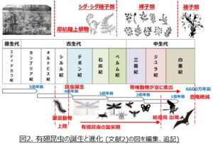 1) 古生代: 水生の植物が陸上に進出後、一部の節足動物が陸上に進出し “昆虫” が誕生。 水生生物の呼吸器系は地上でも機能。 小さな体躯、堅い外骨格は、重力に抗う地上の活動に適合 /デボン紀: 多くの昆虫が、移動や給餌に有利な有翅(ゆうし)昆虫に進化 /ベルム紀: 地球の酸素濃度低下、メガネウラ他の大型昆虫は絶滅 (図2.)