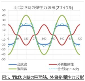 飛翔筋のばねkmu に対し、外骨格のばねKex のばね力が(-)方向に作用する構造とすると、弾性力変化の1次成分に、2次と6次が重なり、台形状の波形となる (図4.図5.)