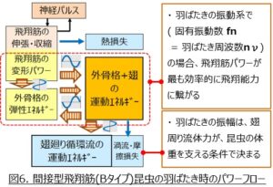 周囲の流体運動のパワー(w) および 飛翔筋の熱損失(w)として消失する (図6.)